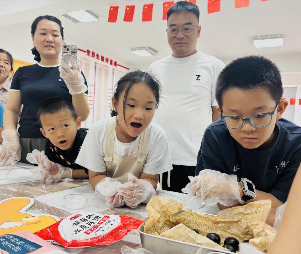 一个小时后,每组家庭都完成了2-3个冰皮月饼,装进社区准备的精美包装盒里。孩子们捧着自己做的月饼,有的迫不及待要给邻居小伙伴看,有的认真对妈妈说:“今晚赏月时吃,要和家人一起分。”