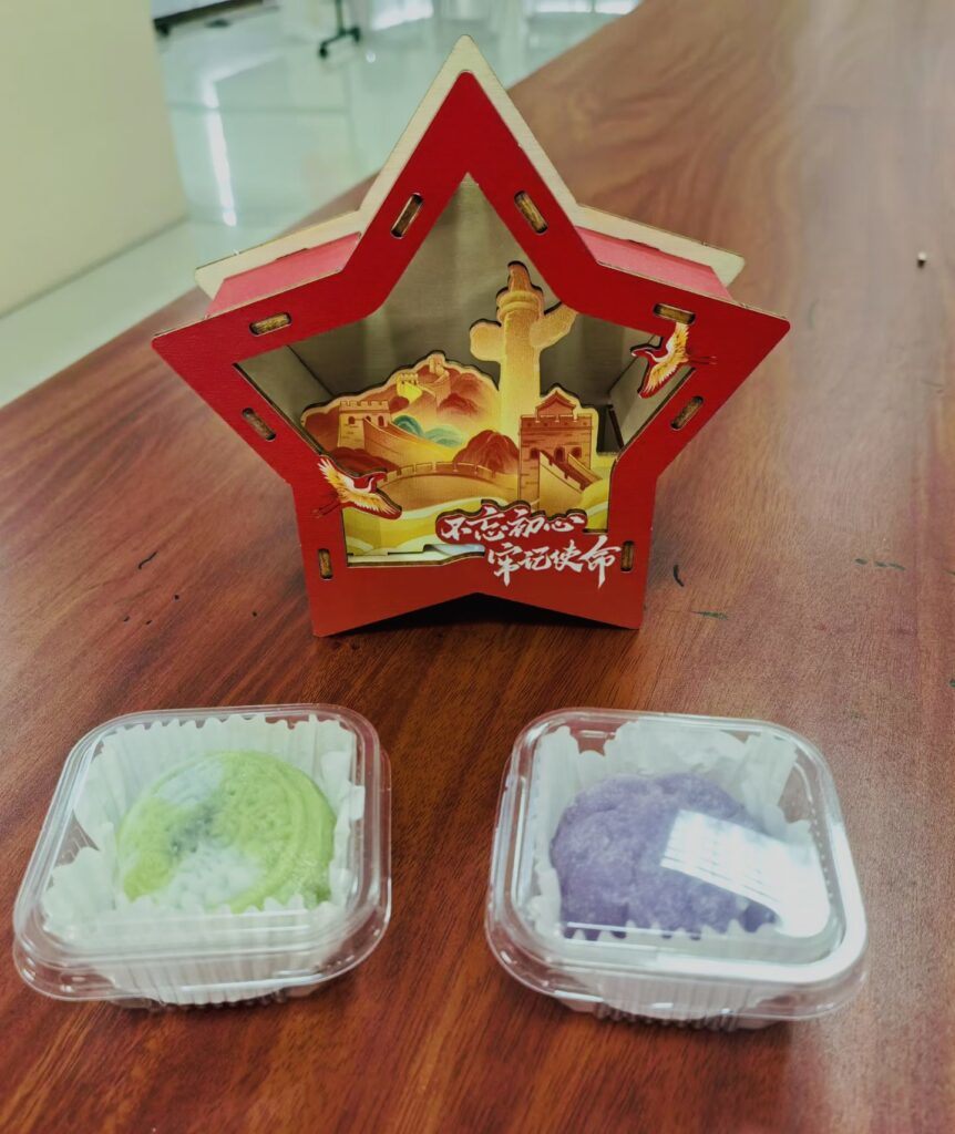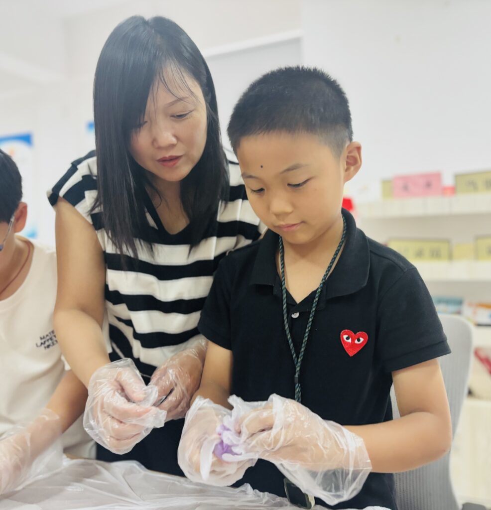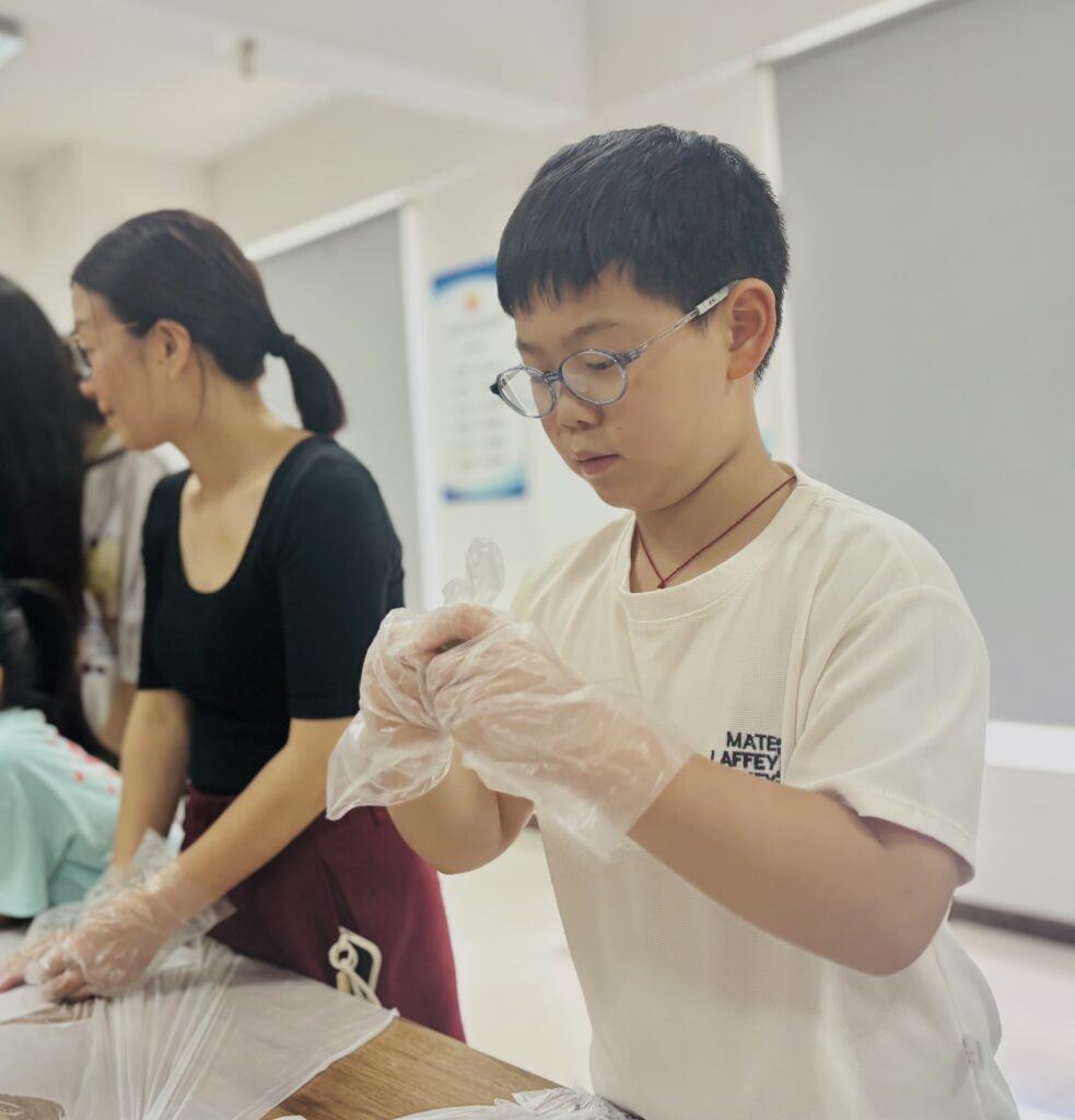 随后,最期待的冰皮月饼制作环节正式开始。老师早已备好预拌粉、馅料、模具和手套。老师先演示步骤:“先把冰皮粉加温水揉成光滑的面团,分成小剂子;再取一块馅料揉圆,用冰皮把它包起来,像给小团子‘穿衣服’;最后放进模具压一压,花纹就出来啦!”