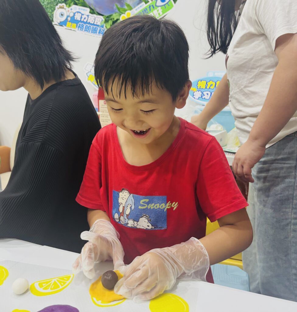 活动伊始,最期待的冰皮月饼制作环节正式开始。老师早已备好预拌粉、馅料、模具和手套,在老师的指导下,孩子们跃跃欲试,在家长的协助下忙开了:有的小朋友小心翼翼揉面团,却不小心把粉沾到脸上,变成“小花猫”;有的家庭分工明确,妈妈揉皮、孩子放馅,压出印着“玉兔”“桂花”图案的月饼时,忍不住击掌欢呼;还有奶奶带着小孙女参加,一边教她捏紧收口,一边念叨:“我们小时候可没这条件,现在陪着孩子做,比自己吃月饼还高兴。”而老师穿梭在各组间指导,帮孩子们调整包馅的力度,提醒大家“冰皮要保持柔软,不然会开裂”。活动室里满是“这个馅太香了”“妈妈你看我做的!”的欢笑声,甜糯的豆沙香、清甜的菠萝馅香混在一起,成了最鲜活的中秋味道。