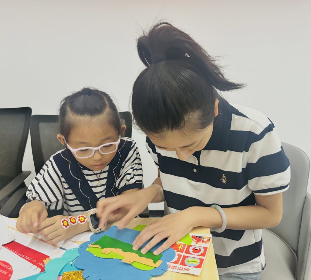 最受期待的“国庆立体贴画DIY”环节将活动推向高潮。老师提前为每组家庭准备了包含天安门、国旗、和平鸽等元素的材料包。亲子们分工协作,拆图案、贴背景、拼造型,原本零散的材料在大家手中逐渐变成一幅幅富有国庆氛围的立体贴画。孩子们兴奋地向家长展示成果,现场充满了欢声笑语。