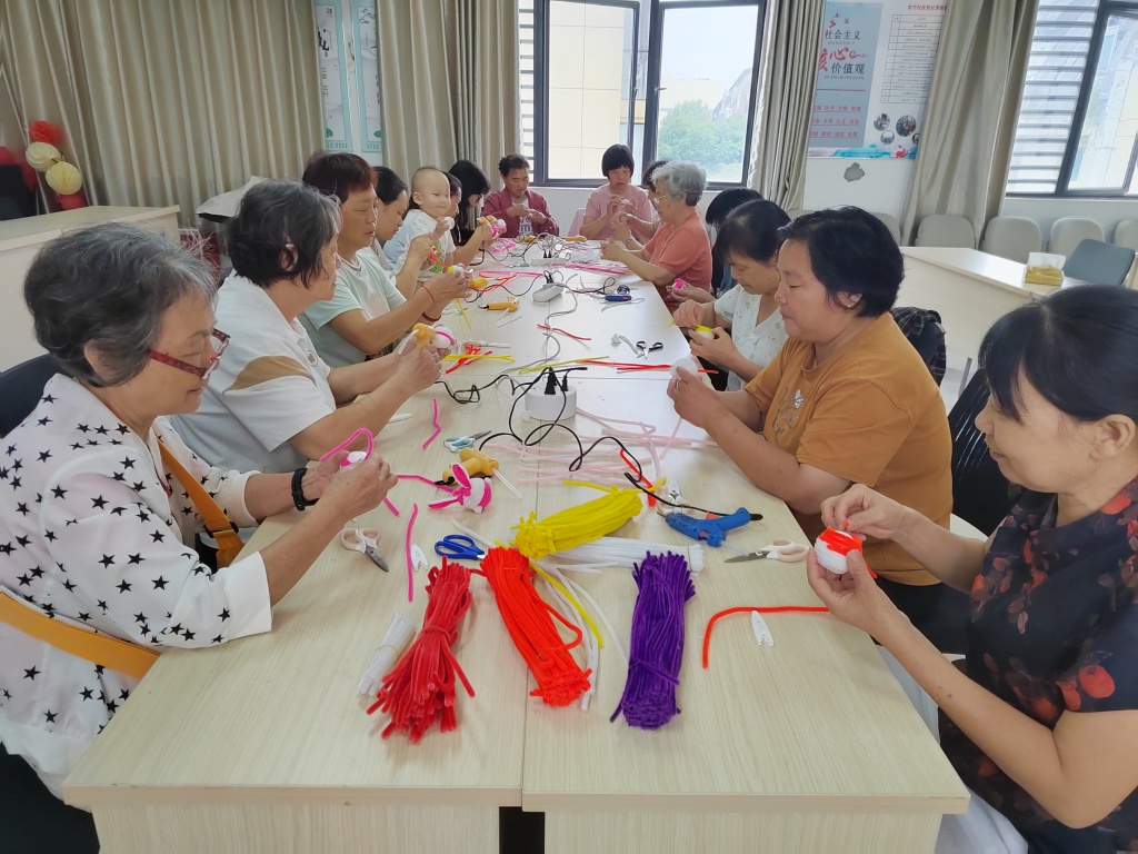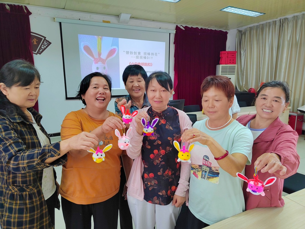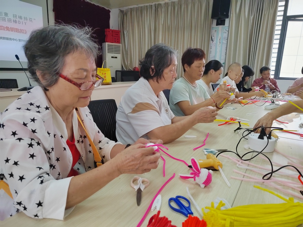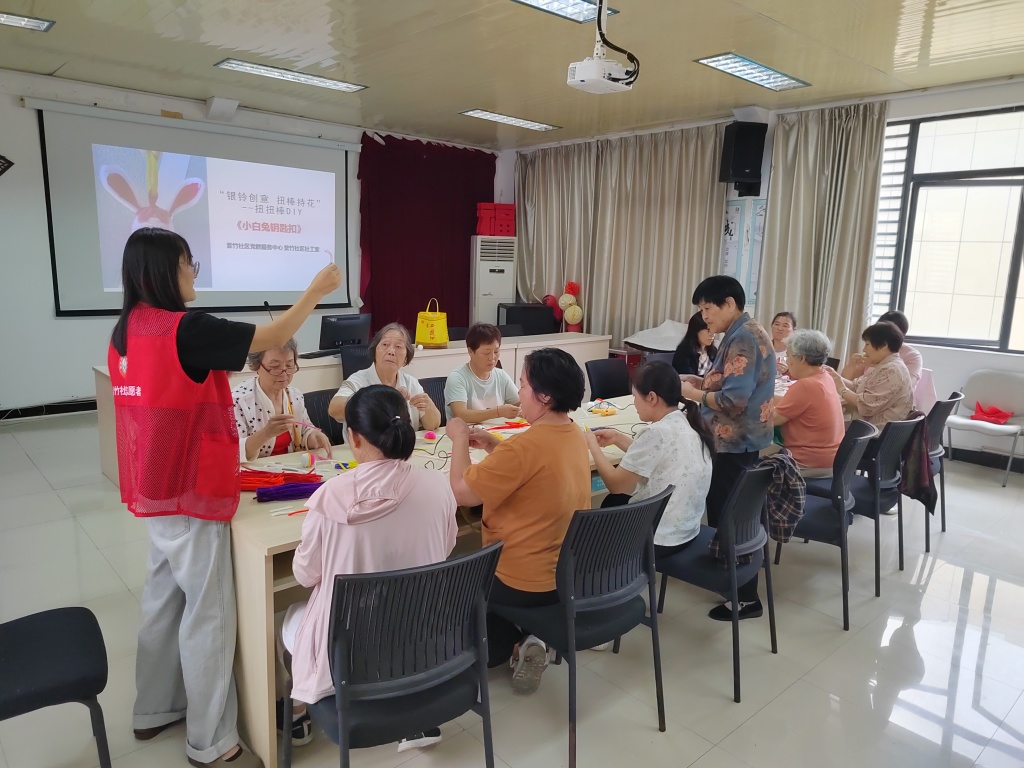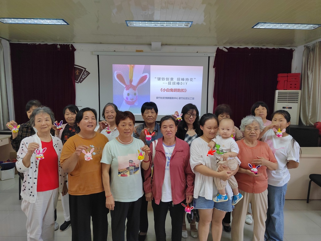 为丰富社区居民精神文化生活,增强邻里互动与社区凝聚力,2025年10月14日,紫竹社区在二楼活动室举办了一场别开生面的‘银龄创意 扭棒持花’扭扭棒小兔子钥匙扣DIY活动。活动以手工制作为载体,吸引了近15位社区居民参与,其中以老年人和妇女为主,现场氛围温馨融洽。