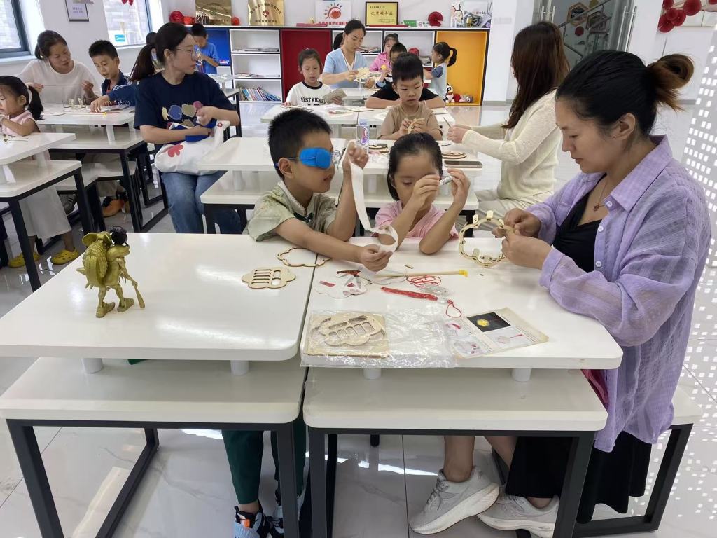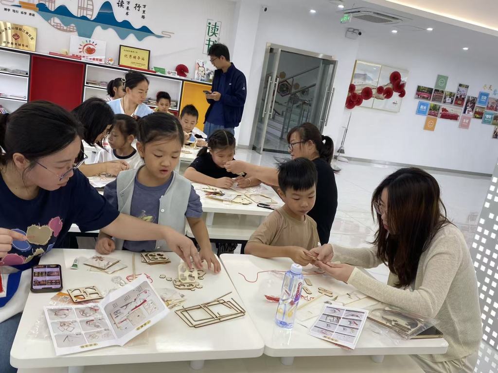 文化讲解结束后,活动进入最受期待的灯笼制作环节。擅长手工的志愿者们共同示范,从竹篾骨架固定到灯笼纸粘贴,再到LED灯串与挂绳安装,每一个步骤都讲解得细致入微。活动现场,亲子家庭分工协作,温馨场景处处可见:有的家长扶着骨架,孩子小心翼翼地涂抹胶水;有的孩子趴在桌上画灯笼图案,家长在一旁帮忙调整角度;还有的家庭边制作边分享中秋计划——“等我们做好灯笼,中秋晚上就挂在阳台上,和爷爷奶奶一起赏月!”经过50分钟的精心制作,一个个形态各异、色彩鲜艳的灯笼逐渐成型。点亮LED灯串后,灯笼瞬间变得灵动起来。“这是我和妈妈第一次一起做灯笼,特别有意义!”拿着亲手制作的灯笼,小朋友们兴奋地相互展示。
