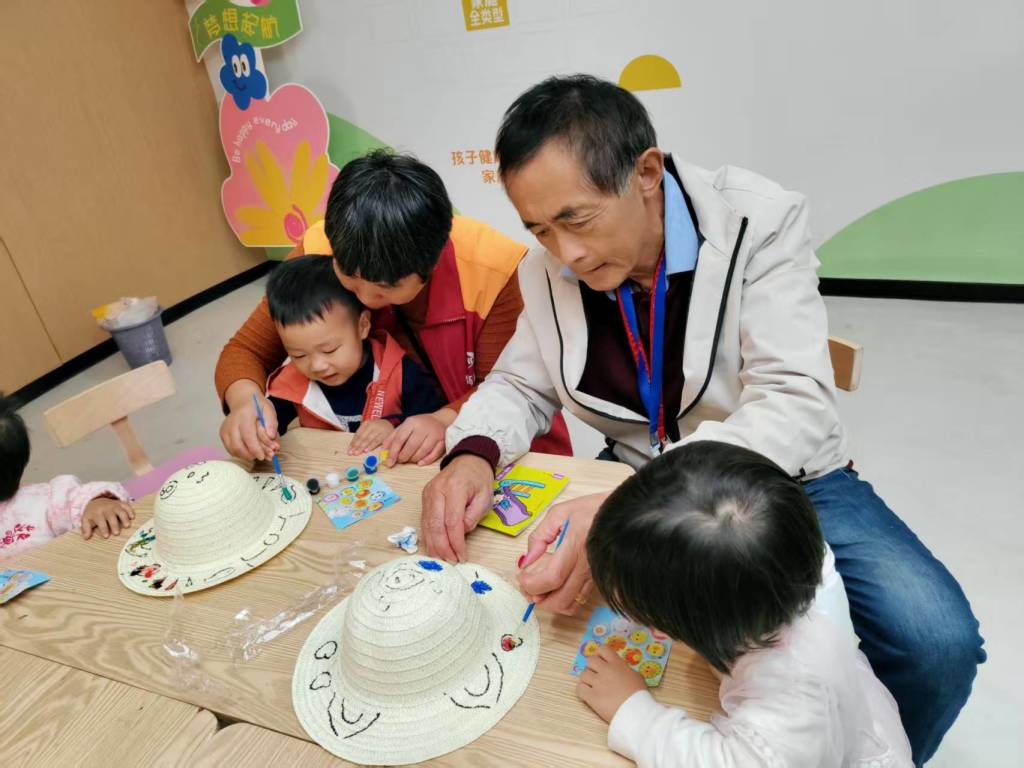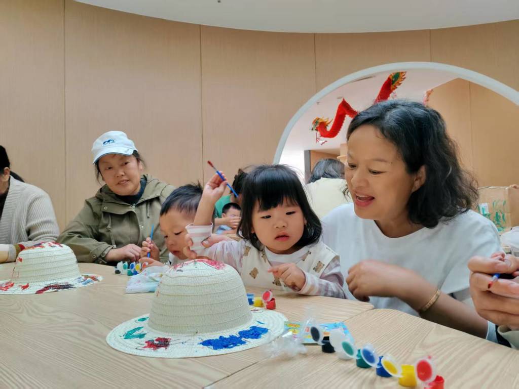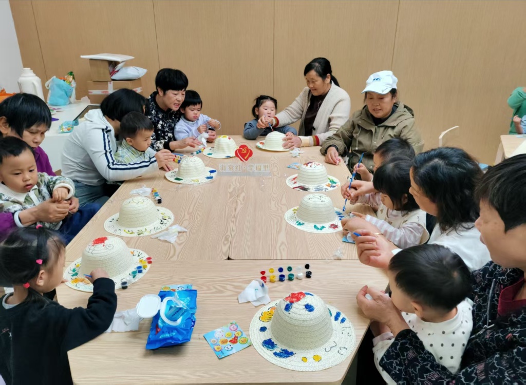 在涂鸦环节,社工为每组家庭分发了空白草帽、丙烯颜料及画笔,并展示“星空向日葵”“彩虹云朵”等创意范例。孩子们或蹲或坐,专注地勾勒线条、填充色彩。3岁的浩浩在帽檐画下全家福,并解释道:“这是爸爸妈妈牵着我的手,像向日葵永远朝着太阳!”家长李女士感慨:“平时工作忙,很少有机会和孩子一起创作,今天看到他这么投入,特别感动。”活动还设置了“色彩魔法站”,提供亮片、贴纸等装饰材料,让草帽更具立体感。经过一小时创作,20余顶草帽蜕变为独一无二的艺术品:有的绘满卡通动物,有的用渐变颜料模拟晚霞,还有的写满对未来的期许。活动尾声,孩子们戴着自制草帽合影留念,帽檐下的笑脸与作品交相辉映。
