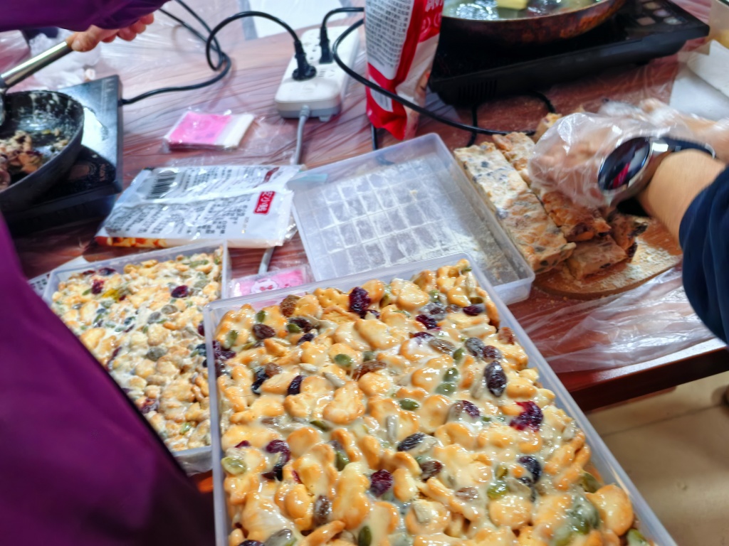 活动当天,社区现场早已布置妥当。在社区工作人员与志愿者的贴心引导下,老年朋友们手持电磁炉、不粘锅、硅胶铲等工具有序到场,脸上满是期待。活动以小组协作形式开展,20位居民分成5组,每组5人分工配合、互帮互助,充分感受团队合作的乐趣。各组桌上,奶粉、核桃、果仁、坚果、棉花糖、黄油等食材一应俱全,为手作环节做好了充足准备。手作过程中,大家跟着步骤有条不紊地操作:先将黄油放入不粘锅中小火熬化,待黄油完全融化后加入棉花糖,不停搅拌至棉花糖与黄油充分融合、变得细腻拉丝;随后倒入备好的核桃、果仁等坚果,再撒入奶粉,快速翻炒使所有食材均匀裹合;待混合物冷却至不粘手时,放入模具中按压平整,冷却定型后用刀切成大小均匀的块状,最后小心翼翼地装入精美的小包装袋中。整个过程里,老人们相互请教、耐心尝试,志愿者在旁随时提供帮助,现场氛围温馨又热闹。