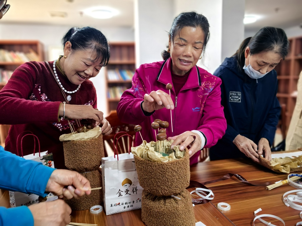 活动现场,社工提前备好栗子、绒布包装袋等材料,志愿者们迅速投入制作。有的俯身挑选饱满栗子,有的手持绒布袋细心装填,遇到操作不熟练的伙伴,大家主动分享技巧、交流心得,现场笑声不断。经过一番忙碌,形态可爱的栗子花束陆续完成,绒布与栗子相映成趣,成为冬日里一道别样风景。志愿者们围在展示区前欣赏作品,脸上洋溢着成就感。“第一次做栗子花束,长见识了!”“和大家一起动手,心里暖暖的!”老年志愿者们纷纷感慨,低龄志愿者也表示活动既丰富了社区长辈的生活,自己也收获了快乐。