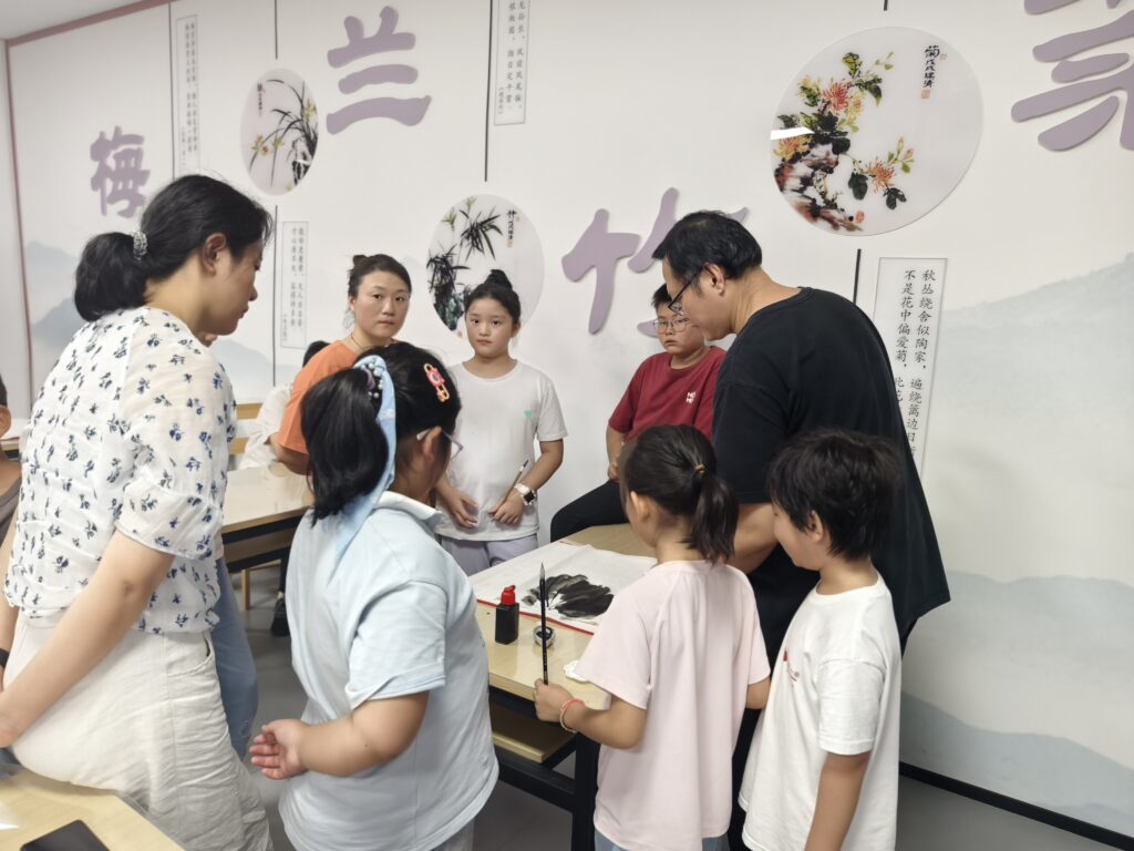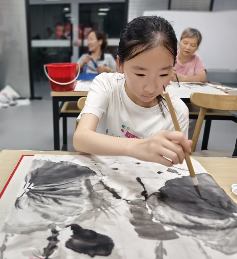 理论知识过后,“水墨国画实践”环节将活动推向高潮。工作人员提前为每位参与者备好笔墨纸砚,专业指导老师现场示范运笔、蘸墨的基本方法,并手把手纠正姿势。在创作过程中,大家亲身体验水墨晕染的奇妙——墨色在宣纸上由浓至淡自然蔓延,勾勒出层次分明的画面;同时感受虚实相生的艺术魅力,通过调整笔触轻重,让画面主体清晰“为实”,背景朦胧“为虚”。孩子们们兴致盎然,一笔一划认真创作,现场墨香四溢,充满了浓厚的艺术氛围。