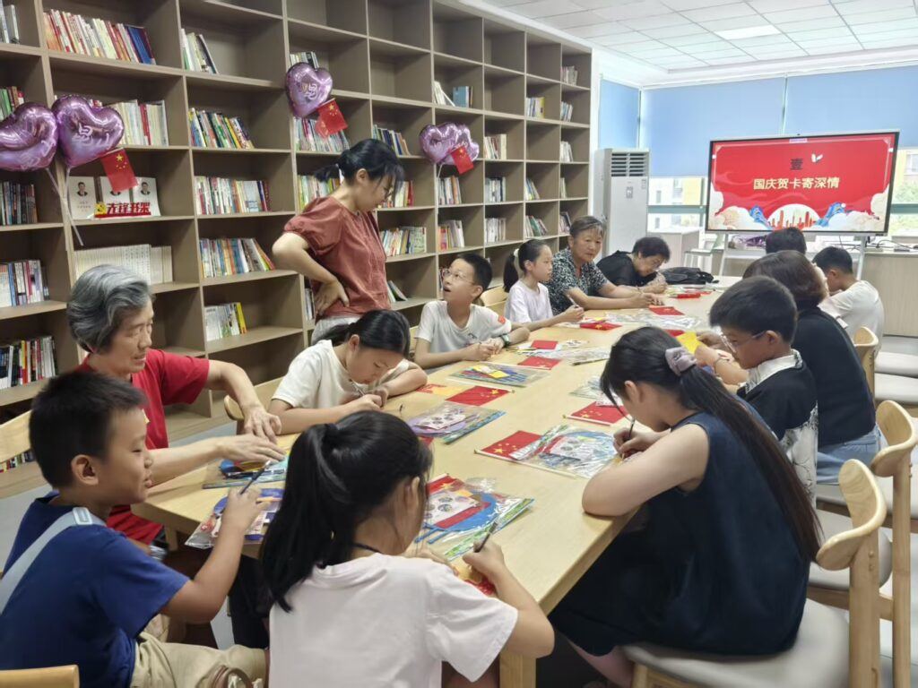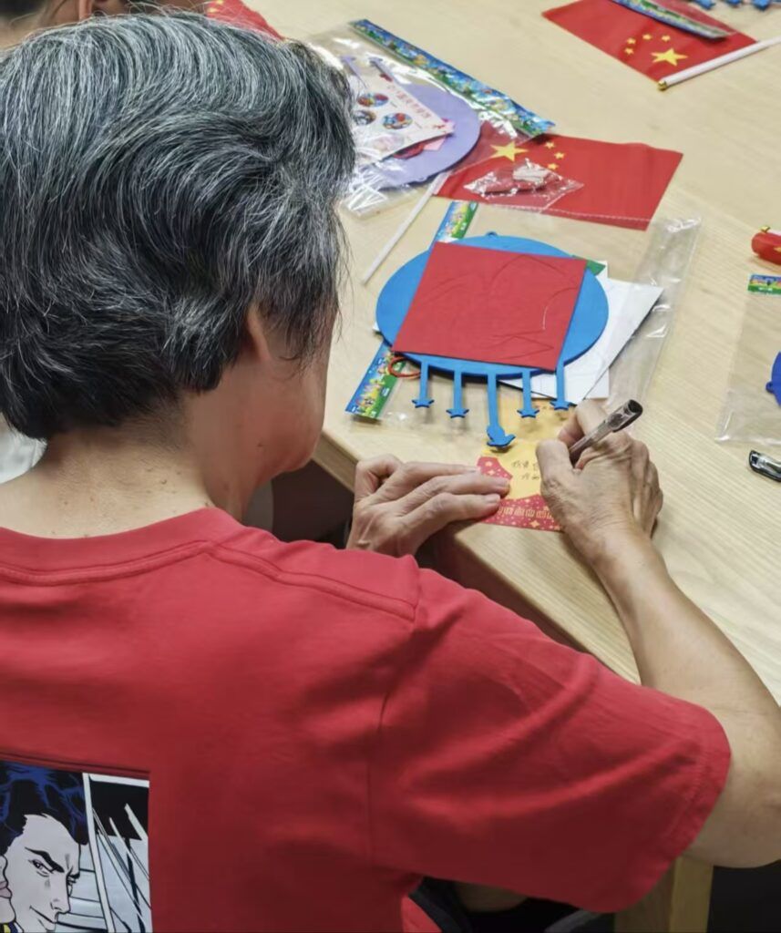 活动伊始,“国庆贺卡寄深情”环节迅速点燃现场气氛。大家围坐一桌,或低头沉思构思祝福话语,或拿起画笔勾勒国庆元素。活动中,大家将对祖国的祝福倾注于笔墨之间。一张张图文并茂的贺卡,既是大家亲手创作的节日礼物,更承载着大家对祖国最真挚的祝福。