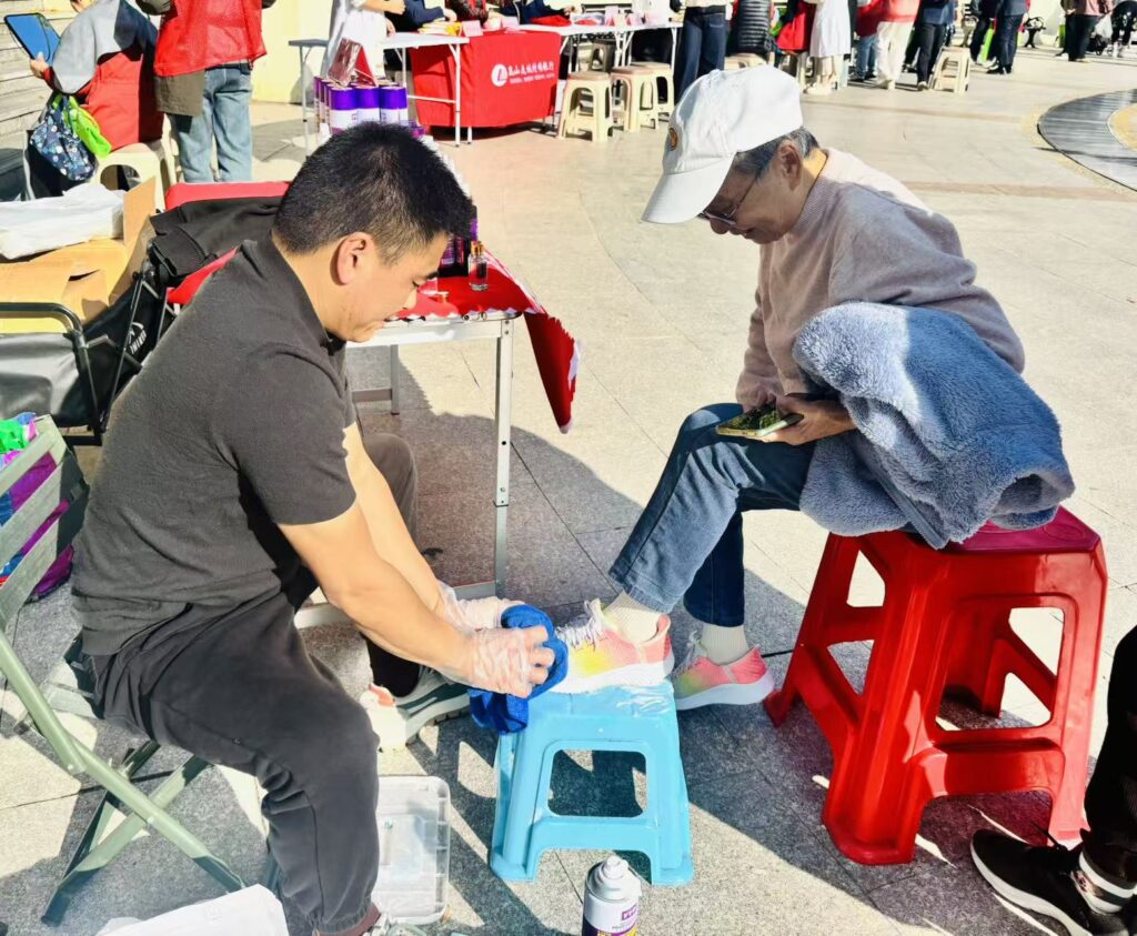 生活服务专区同样热闹非凡。理发师傅手持剪刀娴熟地为居民修剪头发,修剪后的发型清爽利落,居民们脸上洋溢着满意的笑容;磨剪刀的师傅动作麻利,原本锈钝的剪刀、菜刀在他手中很快变得锋利如新;艾灸刮痧摊位前,专业技师为居民缓解肩颈酸痛等不适,让大家在体验中感受传统中医的魅力;擦鞋服务则让居民的鞋子焕然一新,细节之处尽显温暖。此外,反诈骗宣传专区的工作人员通过发放宣传手册、现场讲解典型案例等方式,向居民普及诈骗的常见手段和防范技巧,提升大家的安全防范意识。