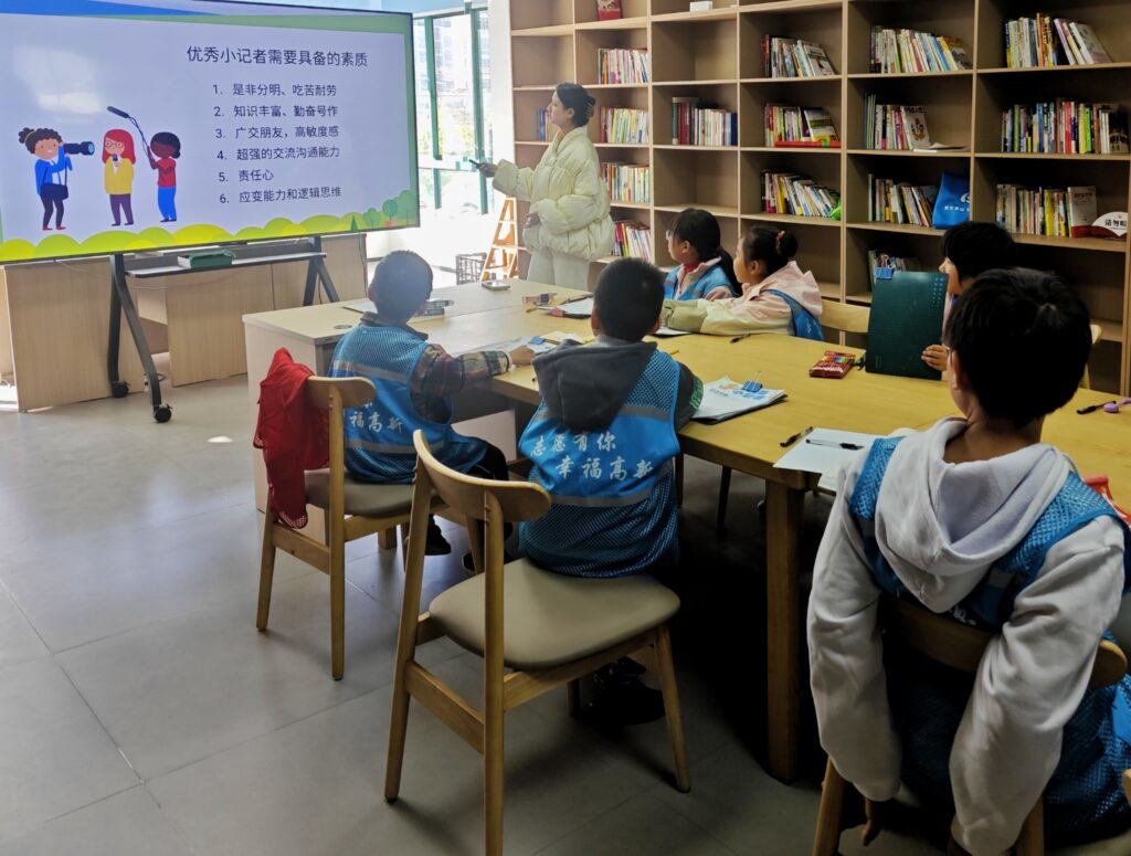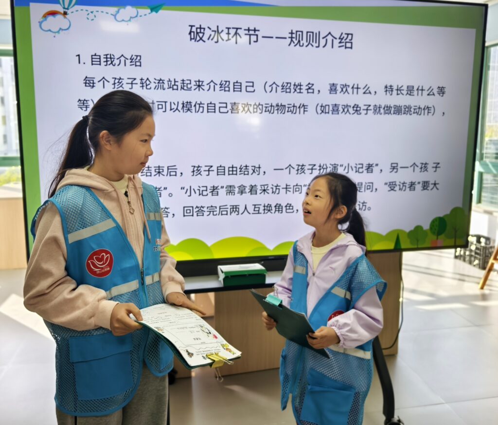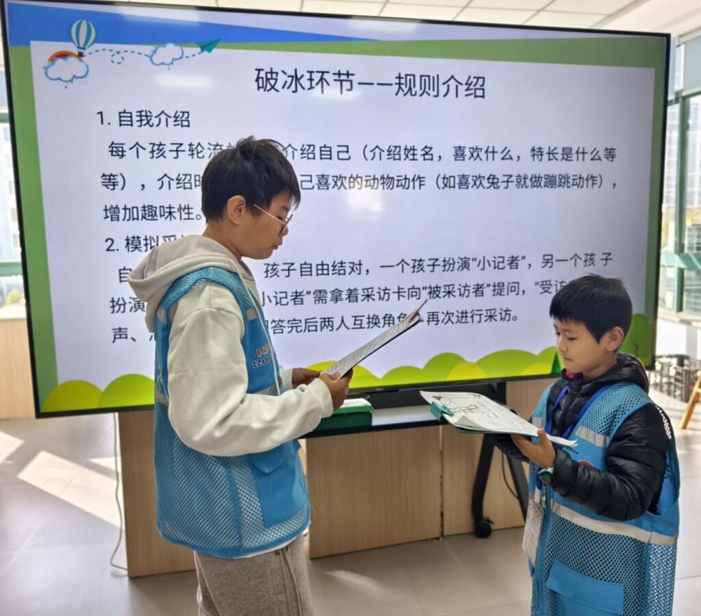 活动现场,小记者们热情高涨,在四个环节的层层推进中收获满满。破冰环节以“自我介绍+模拟采访”小游戏拉开帷幕,小记者们轮流介绍自己,随后两两一组进行模拟采访,有的扮演“小记者”,有的扮演“被采访者”,轻松有趣的互动让大家快速打破陌生感,为后续活动奠定了良好的氛围。