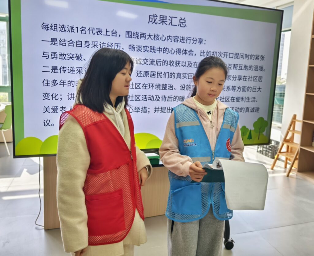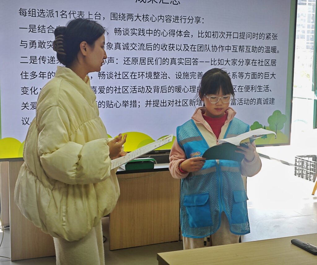 成果汇总环节,各小组依次汇报采访成果。小组成员分工协作,有的汇报收集到的居民民意,有的讲述采访中挖掘的典型社区故事。每组汇报结束后,小组长补充采访过程中的细节与感受,分享采访中的收获与困惑。现场掌声不断,社工老师对各小组的表现给予充分肯定,并对采访成果进行总结点评,鼓励小记者们将此次采访收获转化为参与社区建设的动力。