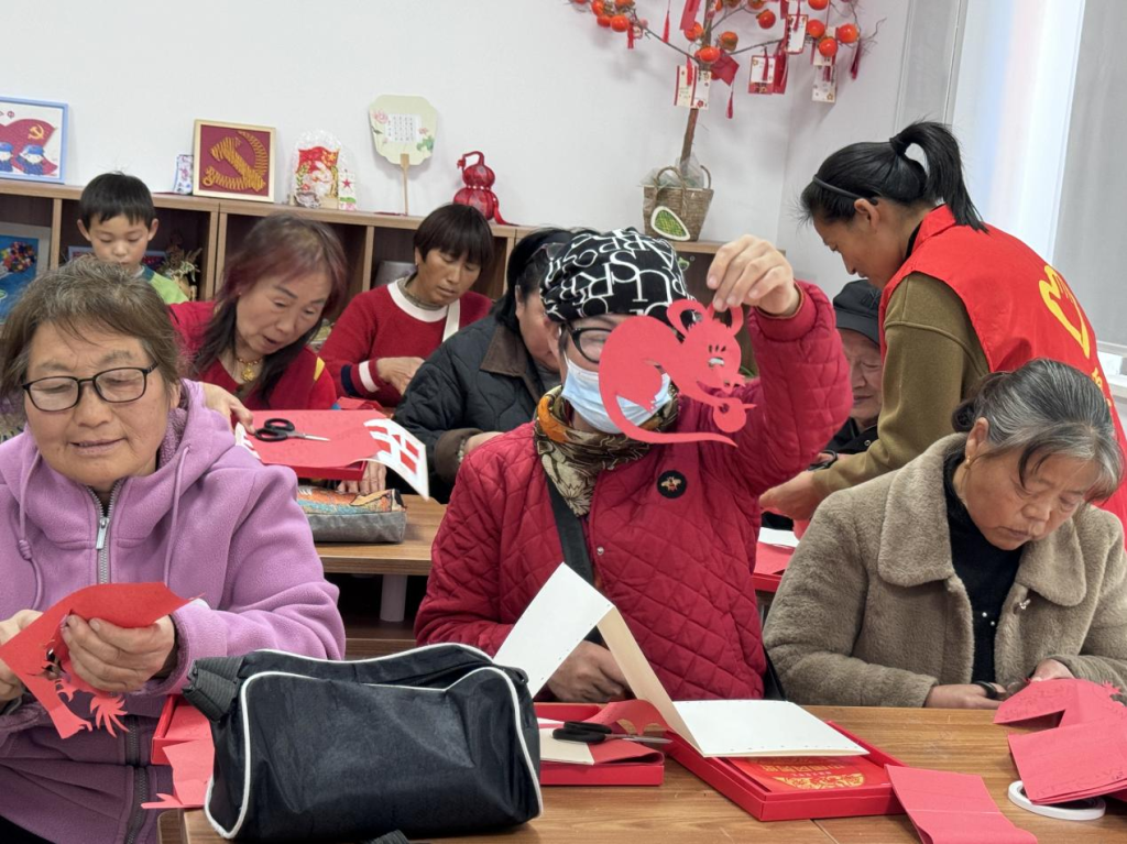 养生讲座结束后,手工剪纸环节温馨开启。社工提前准备了红色剪纸材料、剪刀、刻刀等工具,并为大家发放了寓意吉祥的剪纸图案模板。‘剪纸要先沿着轮廓慢慢剪,注意转弯处要轻柔……’社工耐心讲解剪纸的基本技巧和注意事项,针对动手能力较弱的老人,一对一进行指导。老人们兴致勃勃地投入创作,相互交流技巧、分享经验,现场氛围热烈而融洽。红纸在指尖翻飞,剪刀在手中舞动,一张张普通的红纸经过大家的精心剪裁,变成了寓意美好的福字、栩栩如生的梅花、灵动可爱的生肖等作品。看着自己的成果,老人们脸上洋溢着成就感与幸福感,纷纷展示自己的作品,欢声笑语弥漫在活动现场。