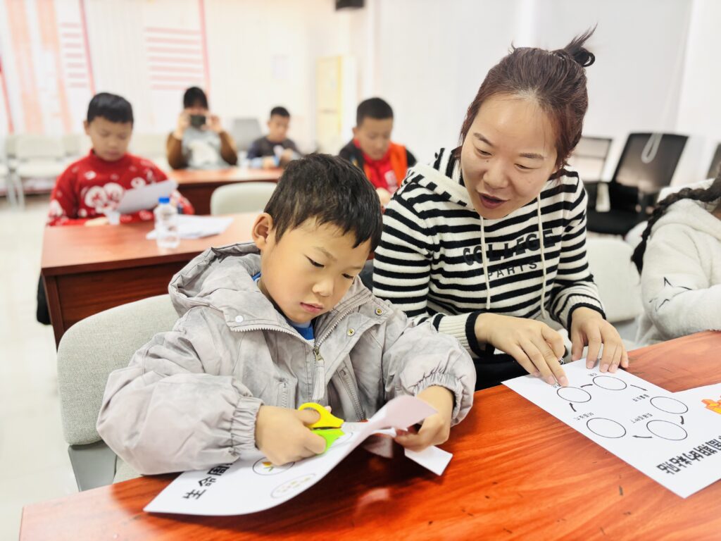 在手工创作环节,孩子们化身“小小设计师”,依据课堂上学到的红薯生长知识,动手剪贴红薯生长周期图。从“埋下种薯”到“长出藤蔓”,再到“地下结薯”,孩子们认真对照步骤,在家长的陪伴下完成作品,不仅巩固了知识,更锻炼了动手能力与逻辑思维,一张张色彩鲜艳的周期图,成为课堂知识最鲜活的呈现。