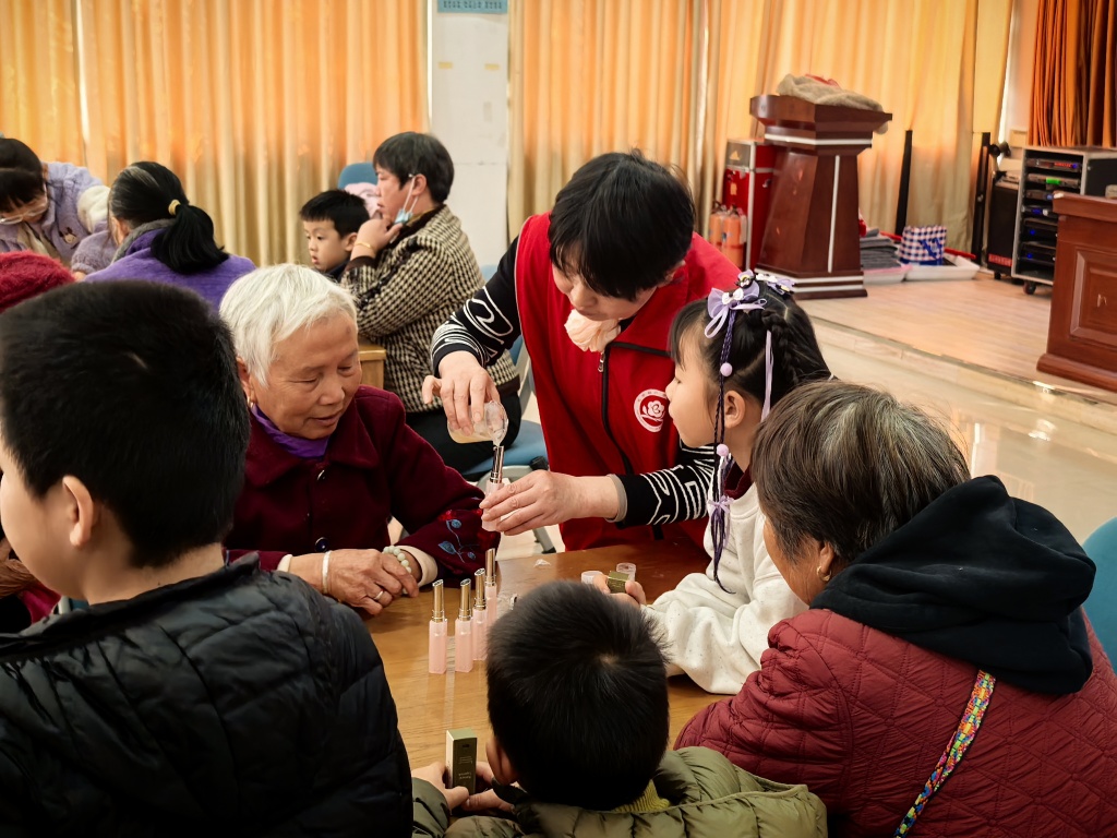 活动以“健康科普+手工共创”为核心,分为三个环节有序推进。首先,志愿者向老年群体普及秋冬护肤知识,重点讲解唇部护理技巧,助力提升生活质量;随后,14组“一老一小”搭档共同制作天然唇膏,从原料调配、加热搅拌到冷却成型,全程协作完成;最后,孩子们亲手为老人涂抹唇膏,并合影留念。活动现场,社区居民杜阿姨表示:“活动形式新颖,既实用又暖心,真正做到了关照居民需求、促进情感联结。”