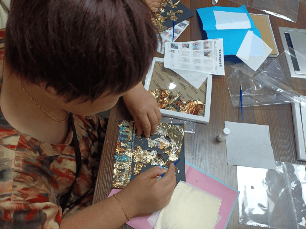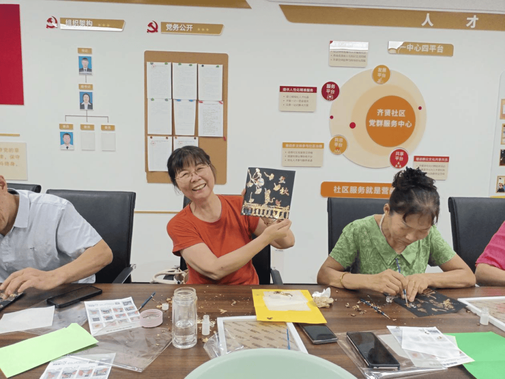 活动的重头戏是充满艺术趣味的手工烧箔画制作。在社工的悉心讲解下,居民们了解了烧箔画的独特技法和创作要点。随后,大家兴致勃勃地挑选着象征丰收与金秋的图案模板——饱满的麦穗、金黄的梧桐叶、灵动的秋蝉……居民们小心翼翼地铺上各色金属箔片,运用特制工具进行贴画,一幅幅独一无二、流光溢彩的“秋日画卷”在大家手中逐渐诞生。过程中,邻里间互相交流技巧、分享心得,专注的神情中透着对艺术创作的投入与喜悦。看着原本普通的箔片在巧手下幻化成金灿灿、充满韵味的艺术品,大家感到新奇与满足。