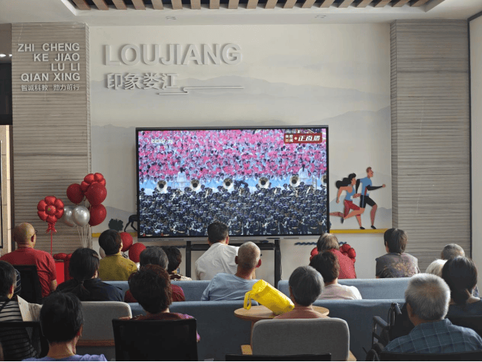 9 月 3 日上午 ,科教园社区党群服务中心大厅内气氛庄重而热烈,一场以 “观阅兵・忆峥嵘・强信念” 为主题的观看大阅兵活动在这里精彩上演。此次活动吸引了50位社区居民踊跃参与,旨在厚植居民的爱国情怀,增强社区凝聚力。