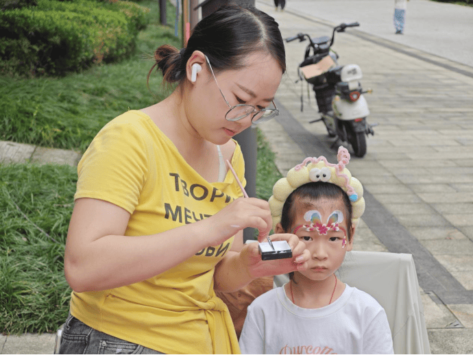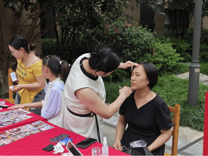 在美妆服务区域,爱心修眉和面部彩绘摊位深受女性居民与小朋友的喜爱。专业的志愿者耐心询问居民需求,精心为大家修整眉形,让大家以更精神的面貌参与活动;面部彩绘摊位前,孩子们围坐成一圈,志愿者手持画笔,灵活勾勒出花朵、卡通人物等可爱图案,原本素净的小脸蛋瞬间变得生动活泼,孩子们对着镜子左看右看,兴奋不已。