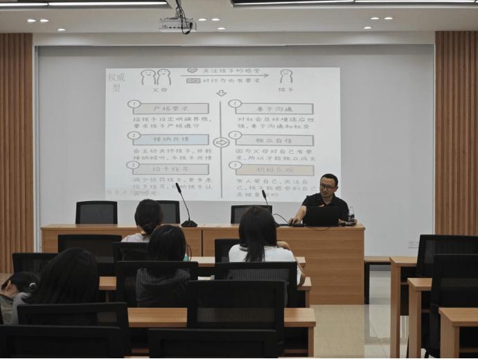在 “家庭互动模式与亲子沟通技巧” 板块,张主任通过 “家长类型测试” 引发全场互动,将家庭教养模式分为权威型、专制型、放任型、忽视型,并详细分析了不同模式对孩子的影响 —— 权威型教养下的孩子更易形成独立自信、善于沟通的特质,而其他类型可能导致孩子缺乏主见、自控力差或攻击倾向。他还引入萨提亚模式,解读 “讨好、指责、超理智、打岔” 四大不良沟通模式的表现与危害,重点传授 “非暴力沟通四步法”:观察事实、表达感受、明确需要、提出请求,通过 “你今天没写完作业” vs “你怎么这么不听话” 等对比案例,让家长直观理解有效沟通与无效沟通的差异。