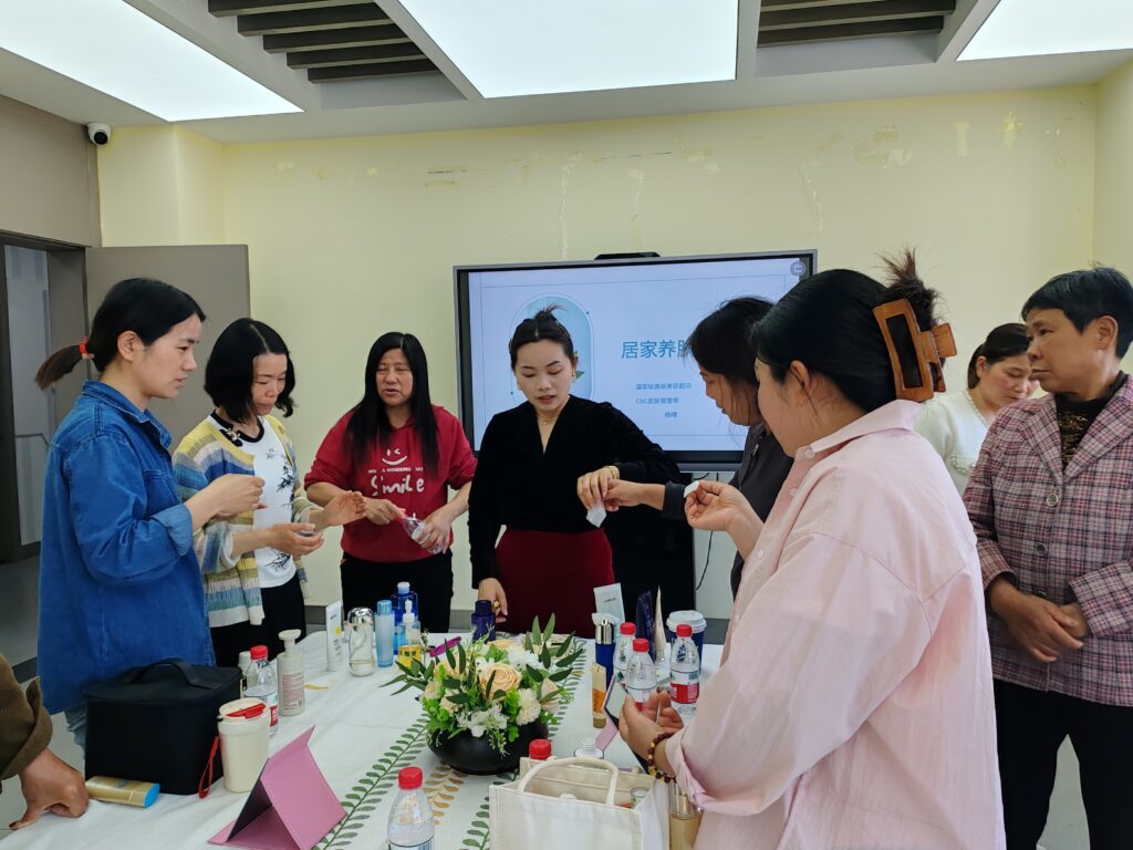 活动伊始,专业护肤老师结合日常生活场景,深入浅出地讲解肌肤护理基础知识,从皮肤结构、日常清洁、保湿防晒等方面展开,用通俗易懂的语言让居民们了解不同肤质的护理要点。随后,老师通过实物演示,手把手教大家如何检测护肤品的好坏,如观察护肤品质地是否均匀、闻气味是否自然纯正,以及利用 pH 试纸测试酸碱度等简单实用的小技巧,居民们纷纷拿出自己日常使用的护肤品现场实践,互动氛围热烈。
