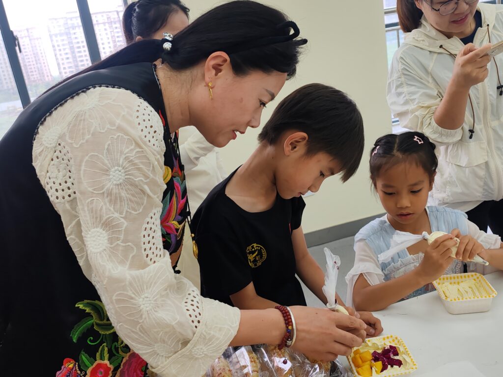 活动中,亲子蛋糕制作环节充满温情。家长和孩子围在操作台前,一起揉面团、抹奶油、摆放水果。有的小朋友小心翼翼地在蛋糕上挤上彩色糖霜,有的和家长合作设计图案,不一会儿,一个个造型可爱的蛋糕就完成了,孩子们举着自己的作品,脸上满是自豪。