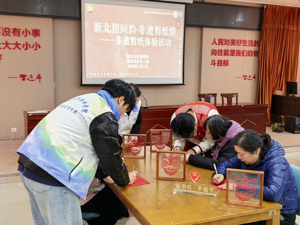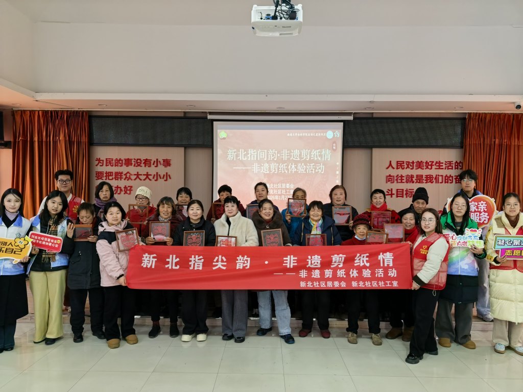 为深化‘福满新北’幸福感提升计划,营造浓郁的新春氛围,1月27日,新北社区在一楼活动室成功举办了‘新北指尖韵·非遗剪纸情’非遗剪纸体验活动。本次活动吸引了20位社区老年居民和6名志愿者踊跃参与,旨在通过传承创新中华优秀传统文化,丰富辖区老年居民的精神文化生活。