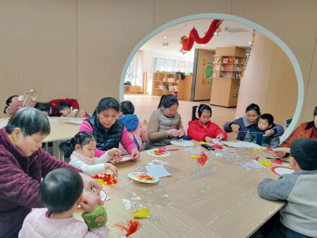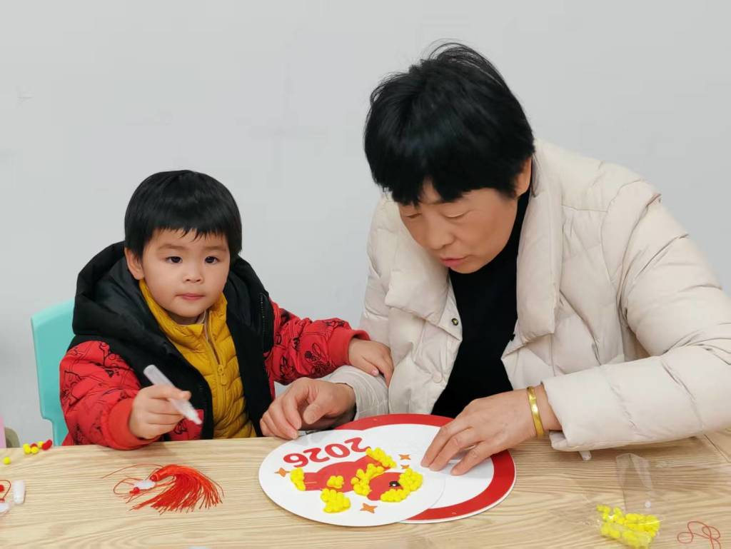 活动的压轴环节是春节毛球贴画制作。社工为每组亲子家庭分发了彩色毛球、卡纸、胶水等材料,并详细讲解贴画的制作步骤与技巧。家长与小宝贝们分工合作,有的挑选毛球颜色,有的规划图案布局,有的细心粘贴固定,一个个充满创意的春节主题贴画逐渐成型。红彤彤的灯笼、胖乎乎的福字、灵动可爱的生肖形象,每一件作品都承载着孩子们对新春的美好期盼,也凝聚着亲子合作的温馨时光。