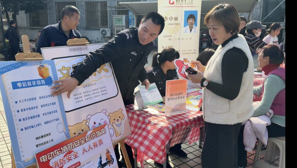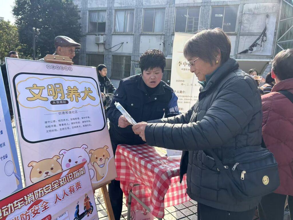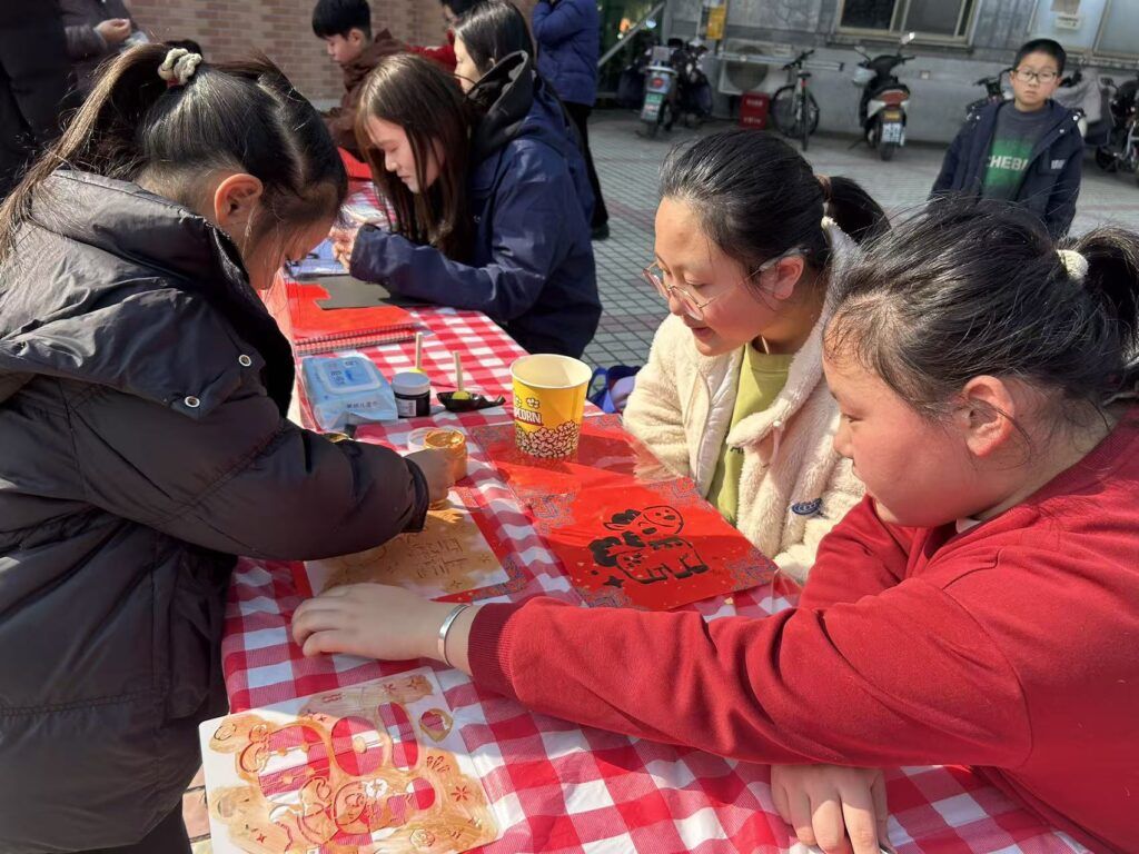 安全宣传区里,警务室民警通过仿真犬模型演示文明养犬规范,结合楼道消防示意图强调”电瓶车禁入楼”的重要性,用通俗讲解筑牢社区安全防线。最受亲子家庭青睐的非遗拓印摊前,儿童志愿者耐心指导居民操作:”压稳雕版,棕刷蘸墨要匀如落雪”,当大家举着”平安””纳福”拓片合影时,春风掀起帐篷一角,将暖阳般的笑容定格成最美新春记忆。