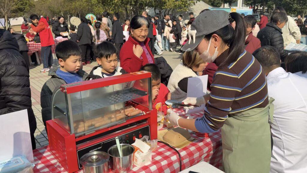 健康服务区同样人气高涨:固生堂中医搭脉问诊,针对冬季养生给出”少盐多姜、艾叶泡脚驱寒”等专业建议;一旁爆米花机”嘭”地腾起甜香,志愿者小周举着烤肠签引导居民参与知识问答兑换美食,王奶奶答对”消防通道禁堆杂物”题后,举着兑换券领取烤肠,油星沾在红围裙上,成了生动的”幸福注脚”。