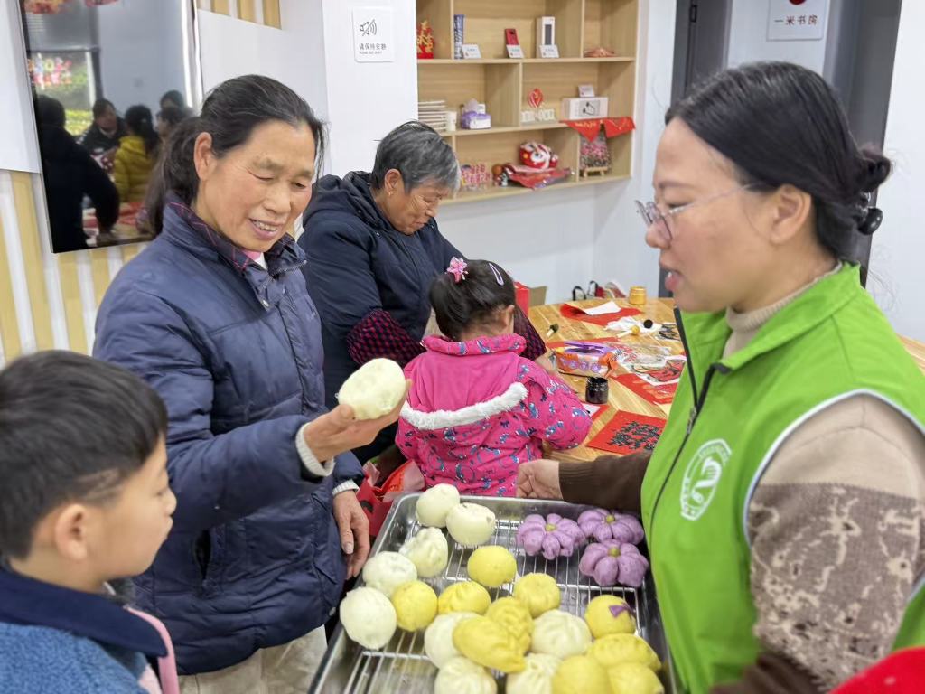 活动现场亮点纷呈,46道由居民精心烹制的家常美食整齐陈列,糖醋排骨、红烧鱼等佳肴香气四溢,承载着家庭的心意与新春期许。民俗体验区里,居民挥毫泼墨写春联、拓印福字,在“马年大吉”“邻里同心”的祝福中感受传统文化魅力;科技手工新年小镇制作区中,孩子们互帮互助搭建创意小镇,盲盒抽奖环节更是欢声笑语不断。蒸包子环节将活动推向高潮,居民分工协作和面、擀皮、包馅,在氤氲热气中分享生活趣事,打破邻里隔阂,让“远亲不如近邻”的传统美德落地生根。