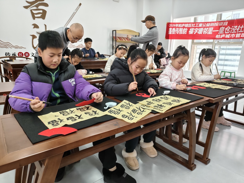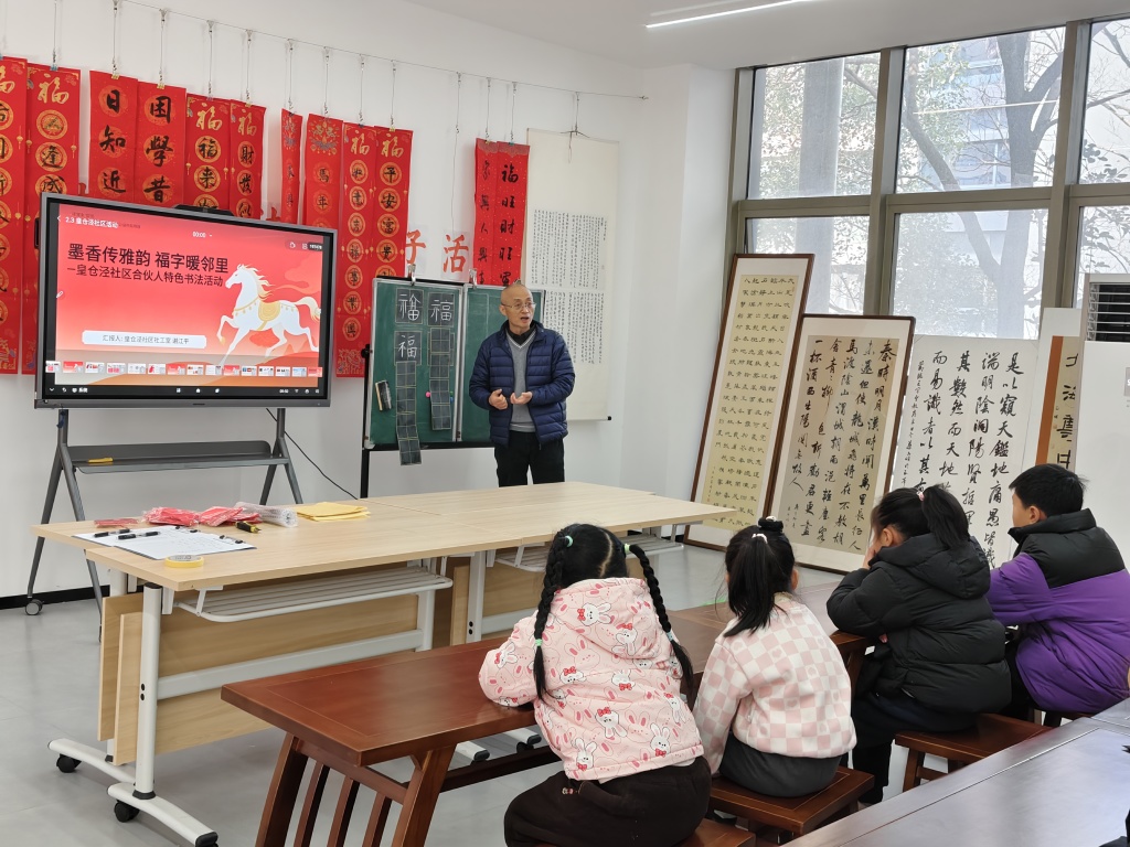 为深入发掘社区合伙人资源,深化社区与合伙人的联动协作,传承中华优秀传统文化,丰富社区居民精神文化生活,营造邻里和睦、喜庆祥和的社区氛围,2026年2月3日,皇仓泾社区社工室特邀请社区合伙人蔡正明老师,开展“墨香传雅韵 福字暖邻里”特色书法活动,吸引了15组亲子家庭参与。
