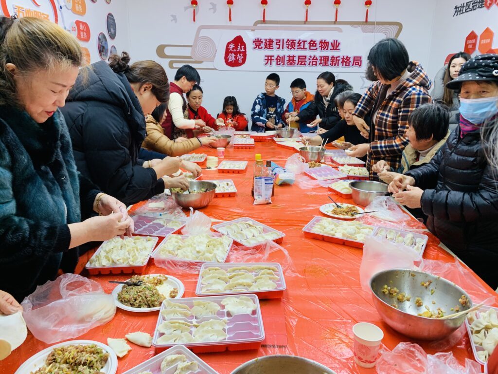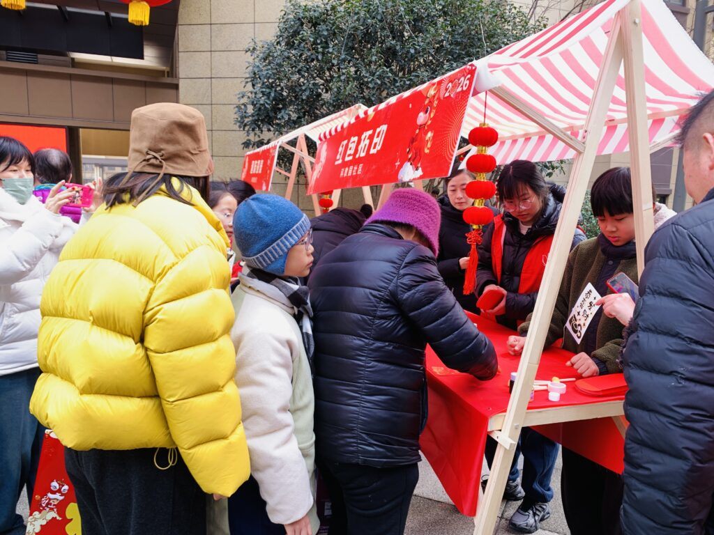 活动紧扣传统年俗与邻里共融主题,精心设置了九大特色板块。在公益理发区,理发师们为居民精心修剪发型,寓意”新年焕新颜”;墨香送福摊位前,书法爱好者挥毫泼墨,一副副饱含祝福的春联和”福”字受到居民热烈欢迎;新年红包拓印体验区更是人气爆棚,居民们亲手拓印寓意吉祥的红色福袋,将新春祝福带回家;趣味投壶与欢乐套圈成为老少皆宜的”人气项目”,孩子们专注投掷箭矢,老人们则交流套圈技巧,成功者领取奖品时脸上洋溢着自豪的笑容。甜蜜爆米花机前,亲子家庭络绎不绝,香甜的气息弥漫全场;暖新驿站专为新就业群体设立,快递小哥、外卖骑手们在投壶游戏中放松身心,还收到了春联和暖心热饮。最温馨的当属包饺子环节,居民们围坐在一起,边包饺子边交流南北包法差异,邻里情谊在欢声笑语中不断升温。