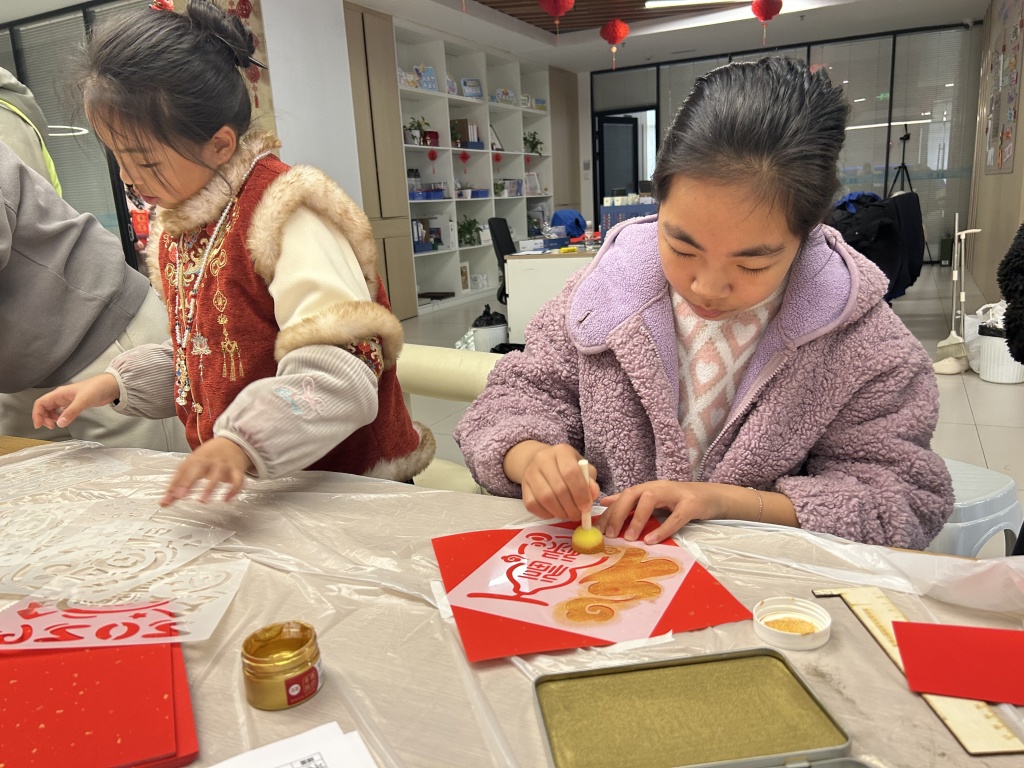 活动伊始,“新春英语亲子共学”环节趣味开场。家长与孩子一同跟随老师,学习春节相关英文表达,在互动游戏里轻松掌握拜年祝福语,欢声笑语回荡在活动现场。共学结束后,非遗手作体验精彩纷呈。亲子家庭携手“写对联”,于笔墨流转间,将对新年的美好祝愿融入字里行间;“拓印福”与“滚筒印刷红包”区域,古老印刷技艺在亲子协作中焕发出新的生机,孩子们好奇地探索,家长耐心指导,共同感受传统技艺的魅力。剪纸区和挂件制作区更是热闹非凡,大家充分发挥创意,一幅幅精美的窗花、一个个寓意吉祥的春节挂件在亲子默契配合中诞生,每一件作品都承载着浓浓的年味与亲情。