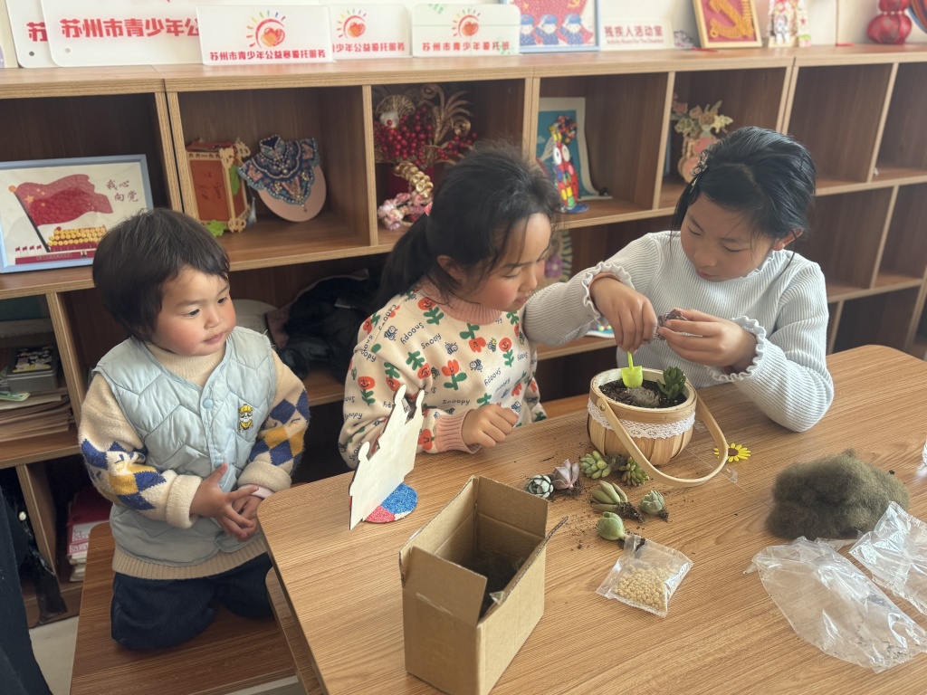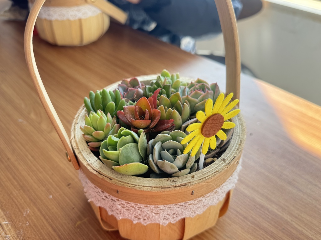 活动伊始,社工通过生动讲解,向居民介绍了植树节的由来及植物对环境的益处,增强了大家的环保意识。随后,在志愿者的指导下,居民们领取花盆、多肉植物及土壤等材料,开始动手制作创意盆栽。现场气氛热烈,居民们互相交流种植技巧,孩子们也在家长的陪伴下积极参与,感受“播种春天”的喜悦。半小时后,一盆盆各具特色的多肉盆栽陆续完成,居民们纷纷展示作品,分享感受,脸上洋溢着满足的笑容。