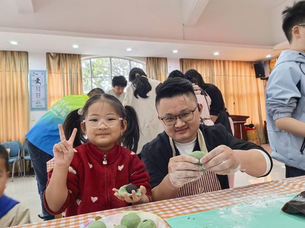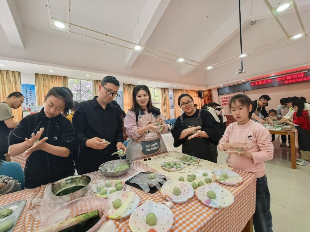 活动当天,社区一楼活动室热闹温馨。亲子家庭自备电子秤、硅胶垫等工具,有序签到入座。社工提前备好糯米粉、艾草粉、红豆沙等新鲜原材料,为活动顺利开展筑牢基础。制作环节以四组家庭为单位协作,家长与孩子共同冲泡艾草粉、揉制青色面团、分割面剂、包馅塑形。孩子们在家长指导下,用稚嫩的小手捏出圆润饱满的青团,现场欢声笑语不断,春日烟火气与亲子温情交织。一位参与家长表示:“社区搭建的互动平台让孩子在实践中了解清明民俗,感受传统文化魅力,这样的活动既有趣又有意义。”