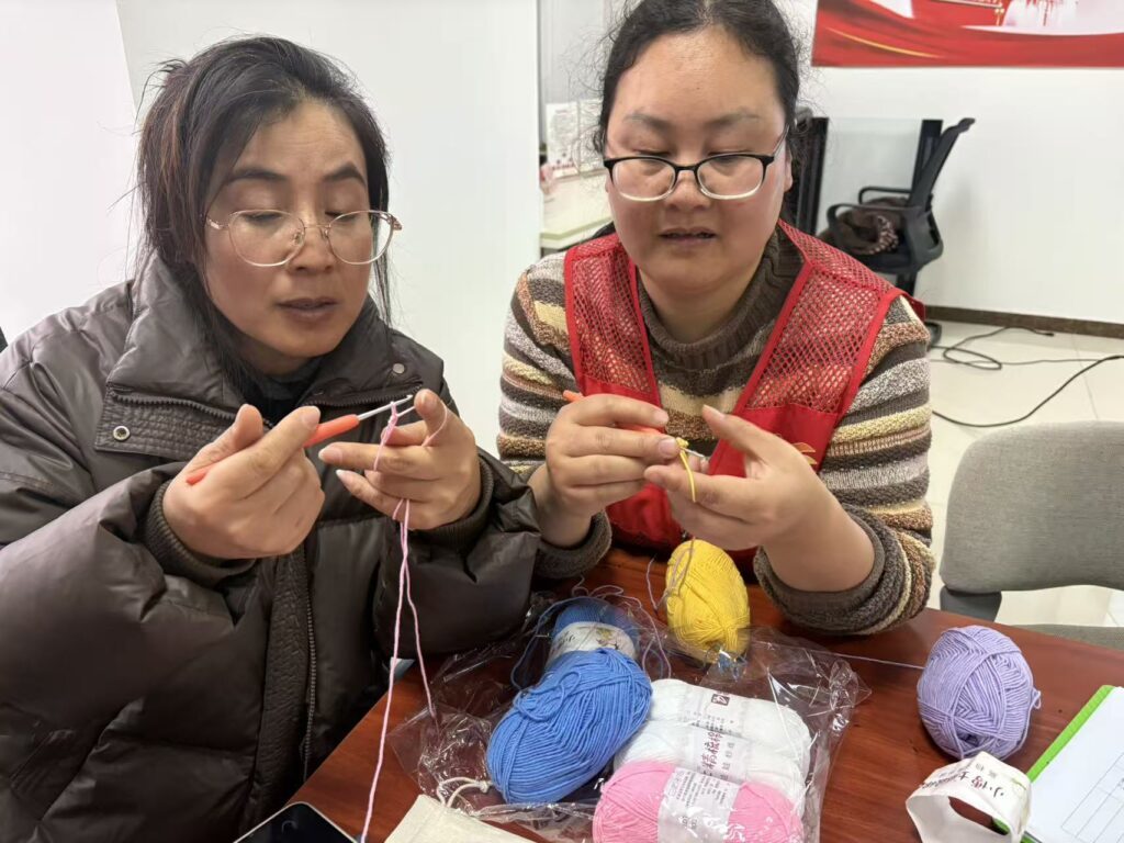各学习小组以组员间互帮互助为学习形式,形成“学得快的带学得慢的,会操作的教有疑问的”良好氛围。小组内成员围坐交流,有人分享自己摸索出的绕线小技巧,有人主动为同伴讲解针法逻辑,遇到共同的难题时,大家一起向讲师请教,再相互传达学习要点。从生疏的握针尝试,到逐渐熟练的针法操作,在反复练习与彼此帮扶中,一个个形态各异的基础小花陆续在队员们的指尖成型,勾针技艺的入门学习在协作中高效推进。