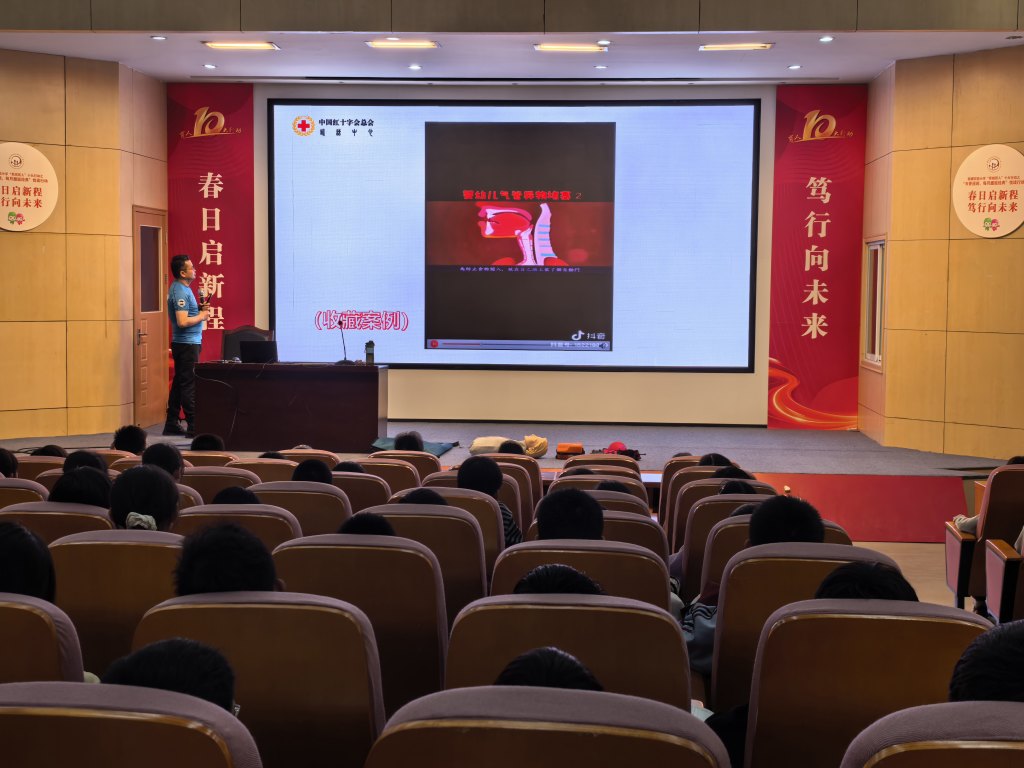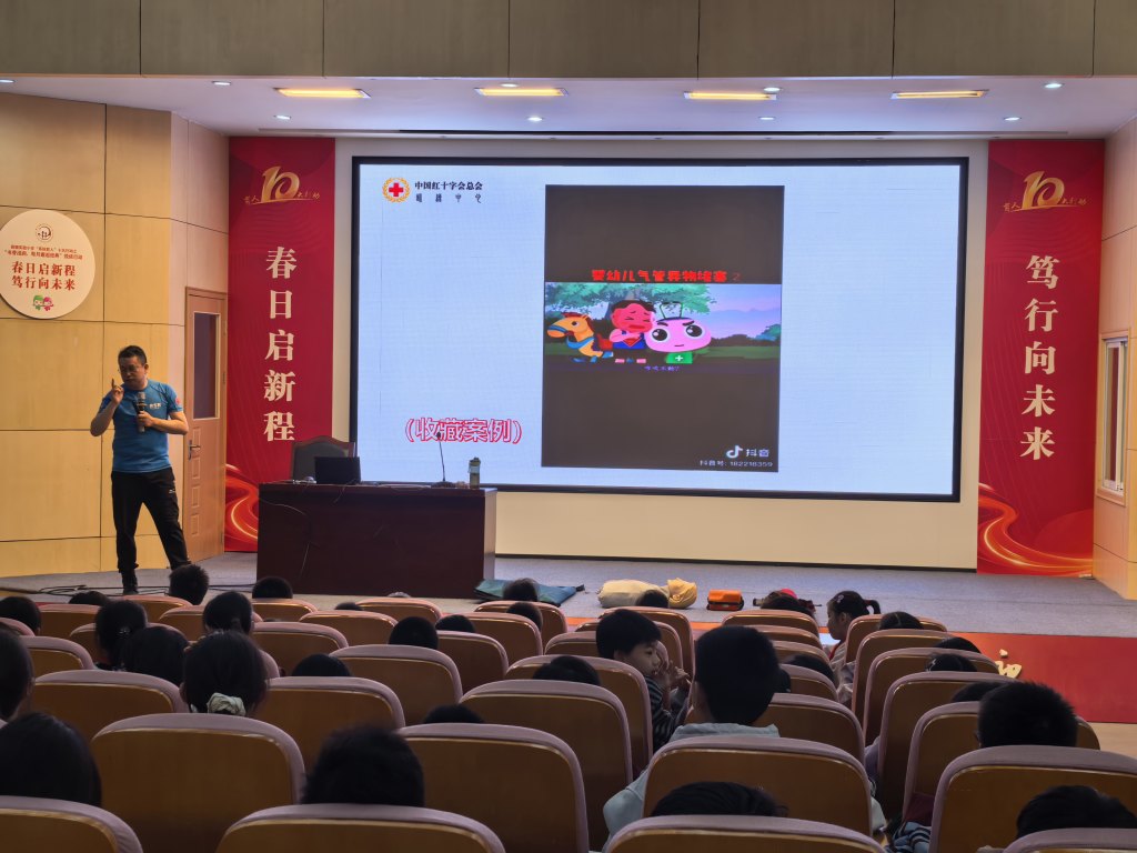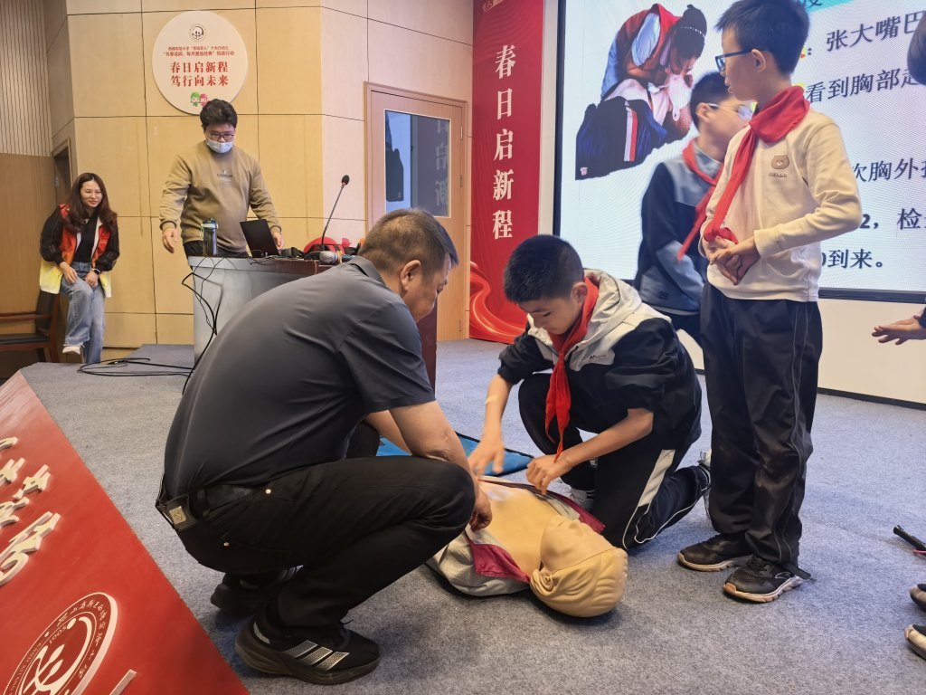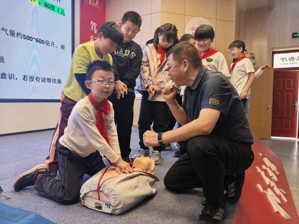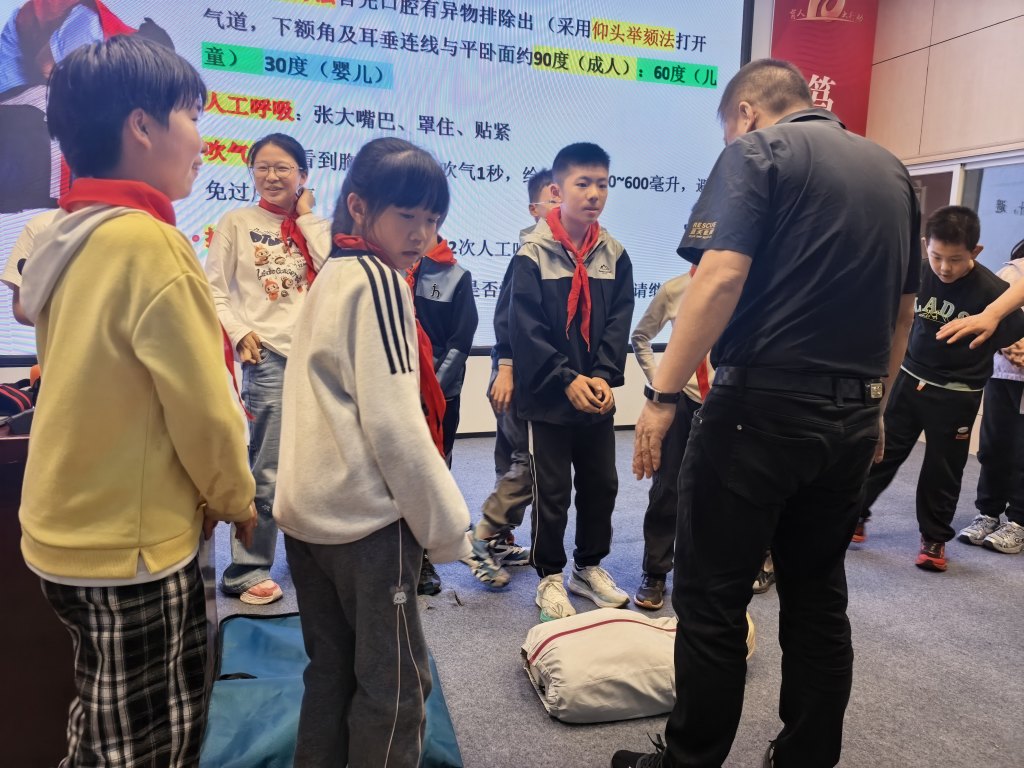活动现场,蓝天救援队队员以生动案例切入,结合PPT、动画视频和真实救援视频,将复杂急救知识转化为趣味化内容。例如,通过动画演示气道梗阻时的身体反应,用真实案例说明及时施救的重要性。在实操环节,队员们详细讲解心肺复苏标准流程,并邀请孩子上台体验海姆立克急救法,手把手纠正动作偏差。互动问答环节中,孩子们踊跃抢答,答对者获赠精美伴手礼,现场气氛热烈。