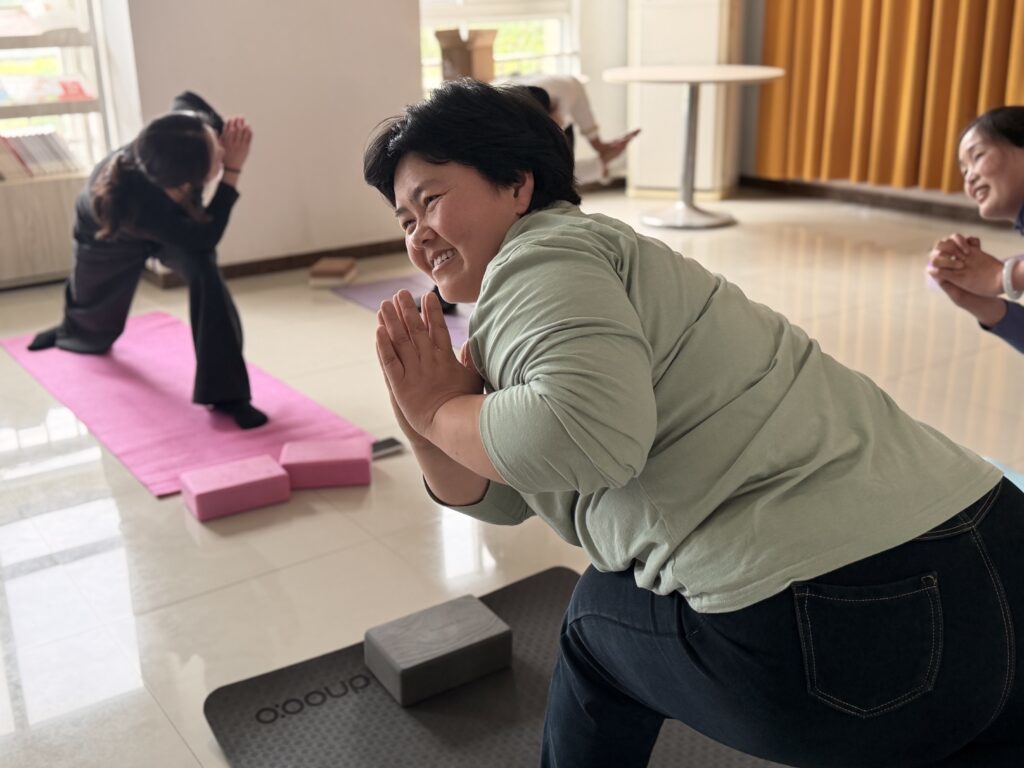 本次瑜伽课由社区健康合伙人专业瑜伽老师授课,课程节奏舒缓、内容实用,贴合社区居民日常健身需求。课程伊始,老师带领大家进行呼吸调整与全身热身,通过颈部、肩部、腰部、髋部、脚踝等关节活动,充分激活身体,预防运动损伤。